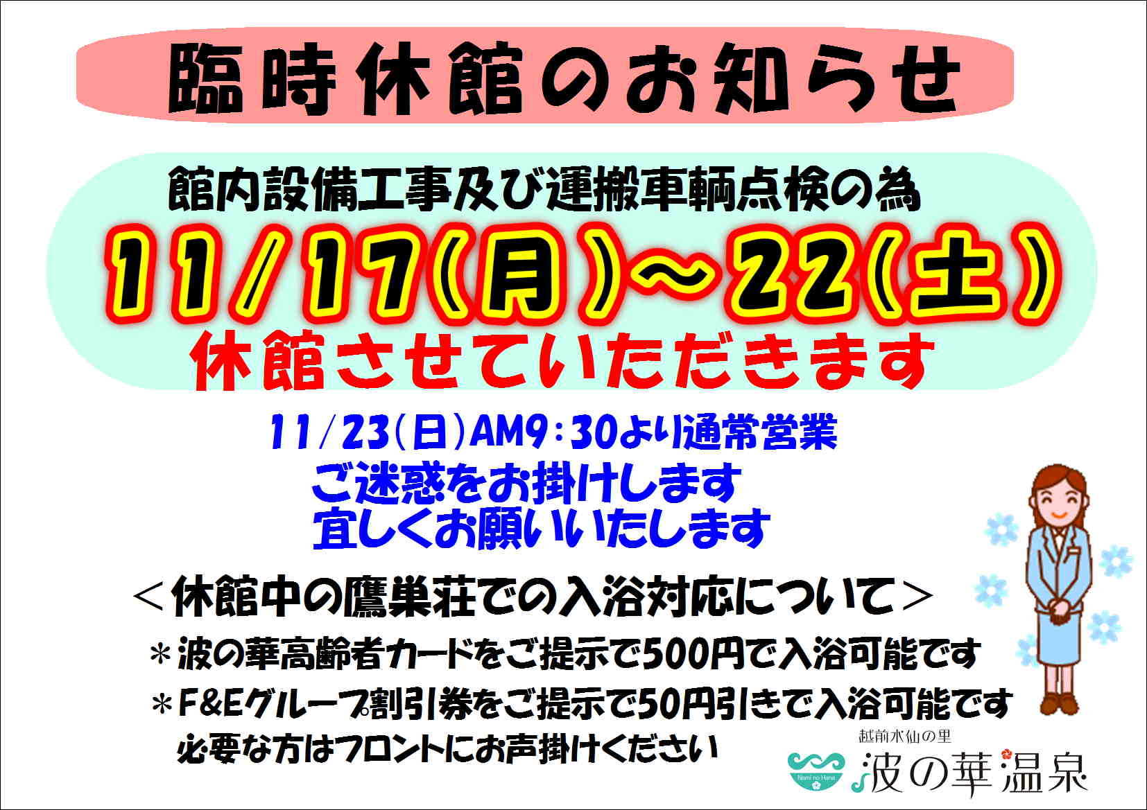 ※暴力団及びその関係者とみなされる方、刺青・タトゥー及び泥酔の方、ペット類のご入館は固くお断りいたします。